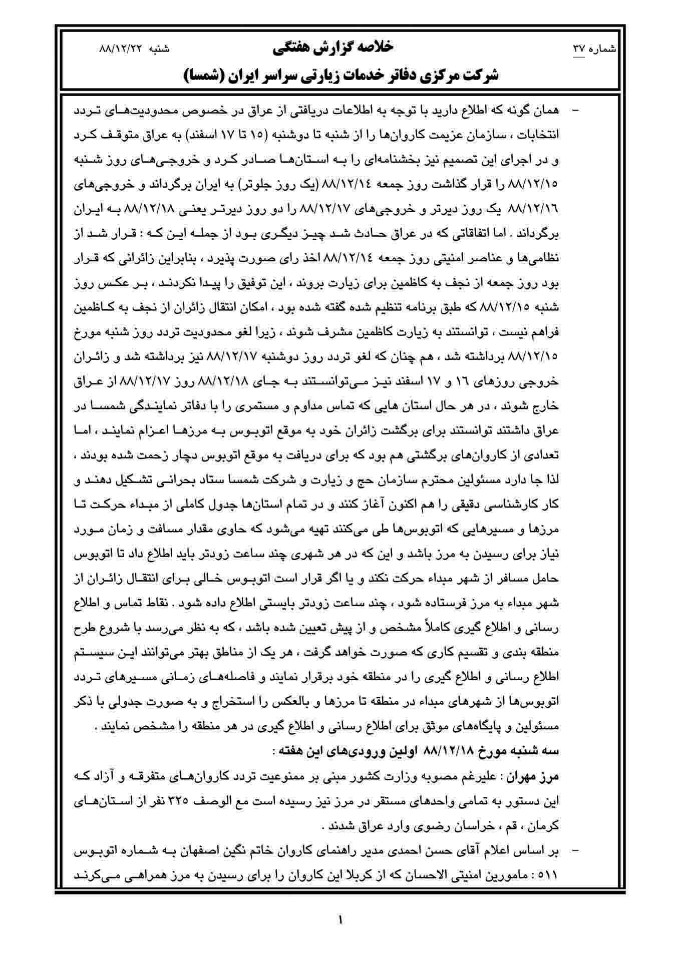خلاصه گزارش هفتگی شنبه 22/12/1388